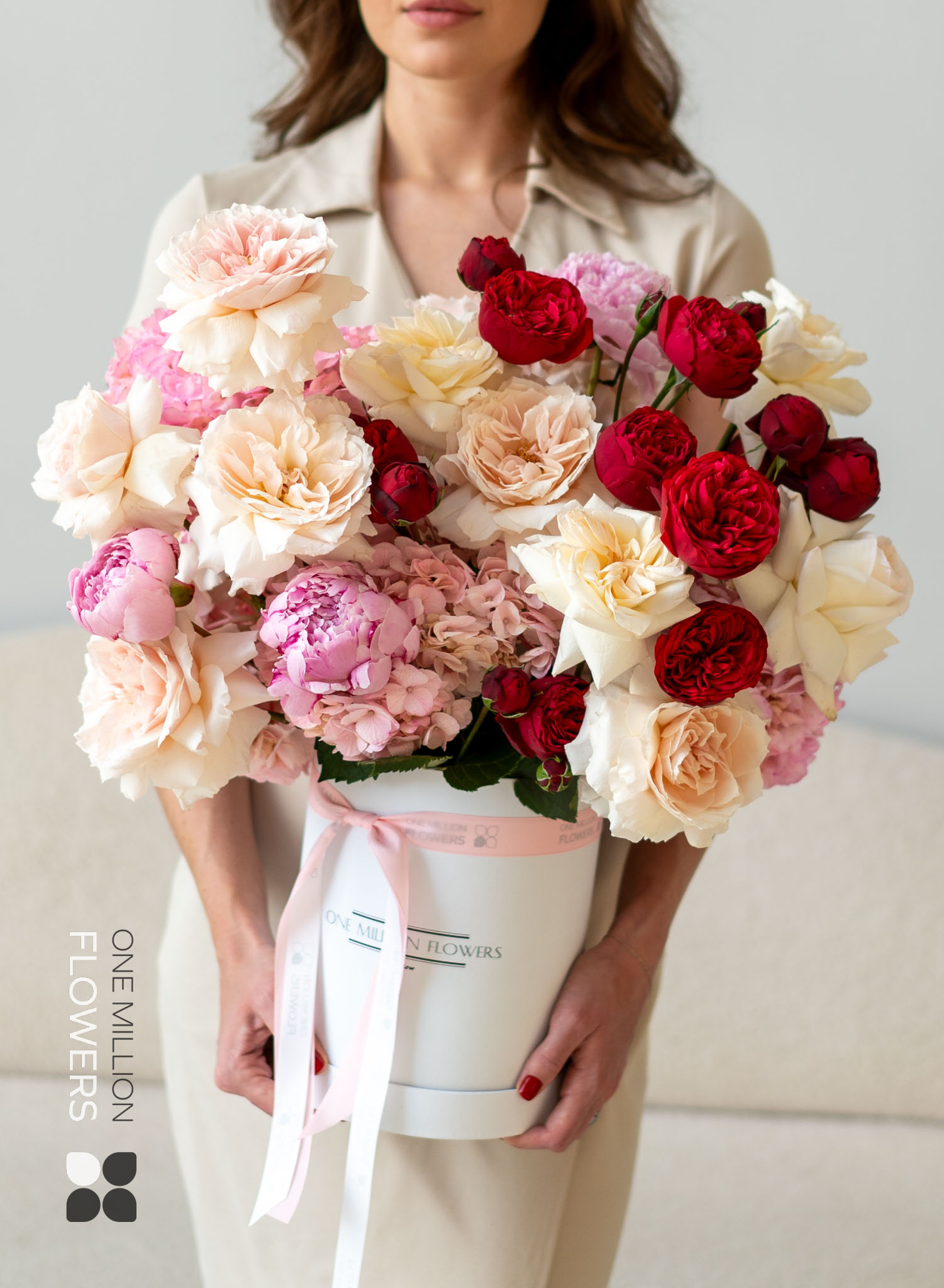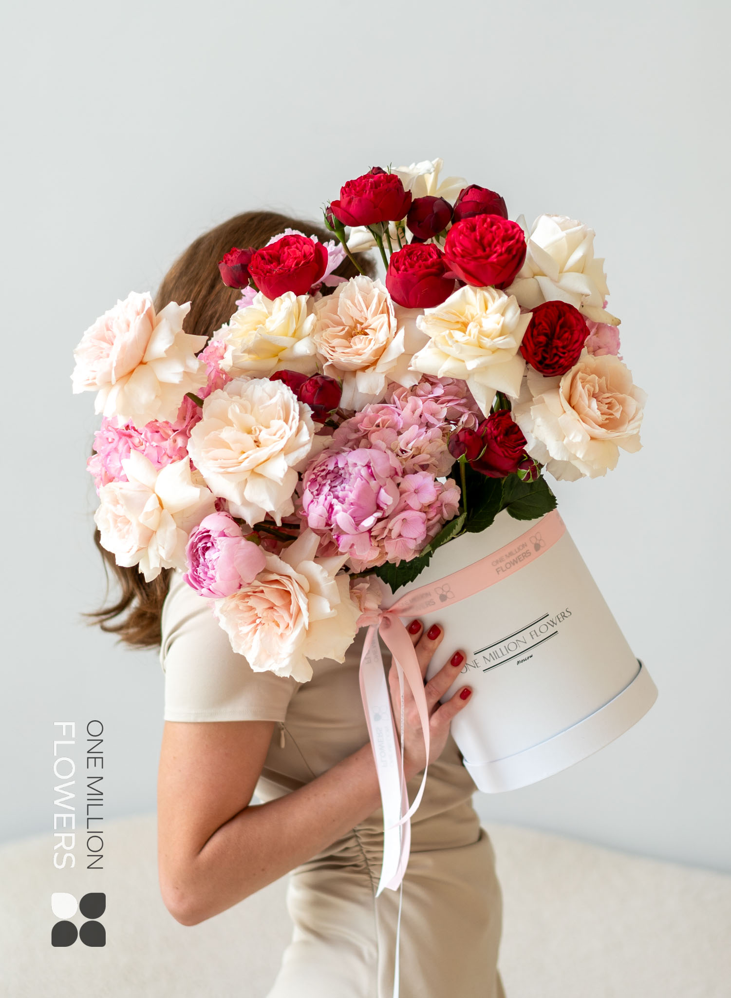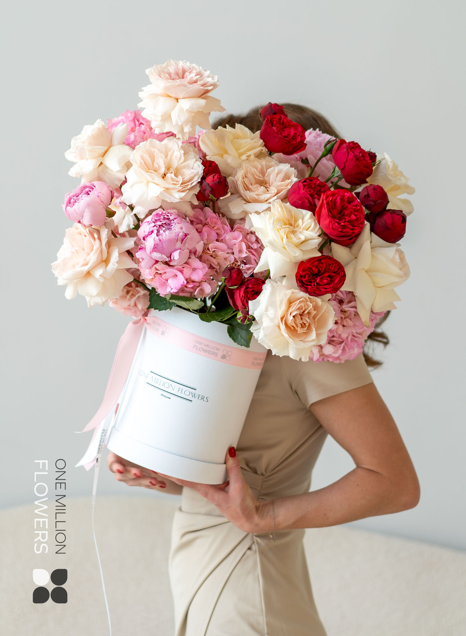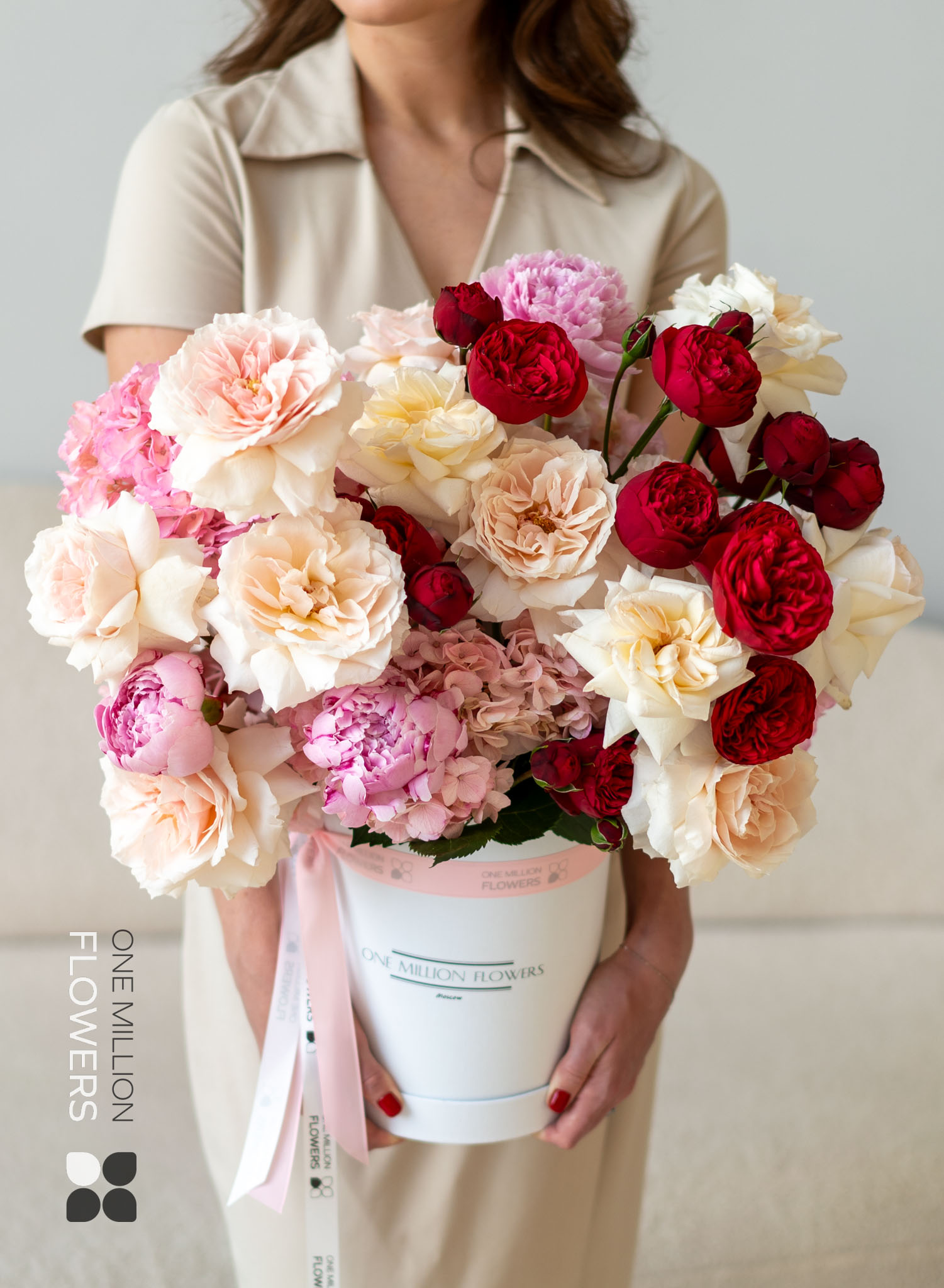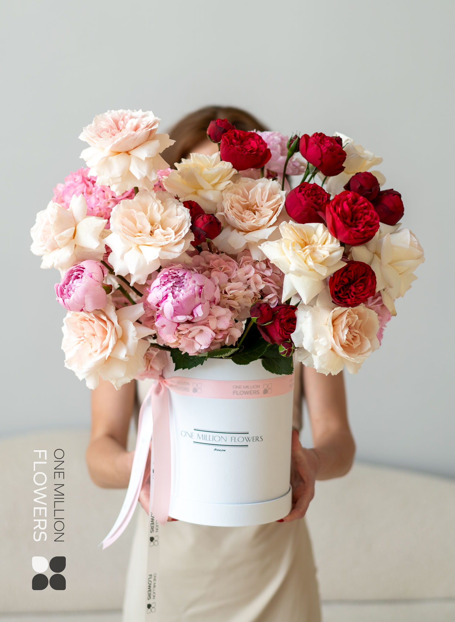 ???? Премиальный состав: редкие сорта пионовидных роз и гортензий придают букету роскошный вид.